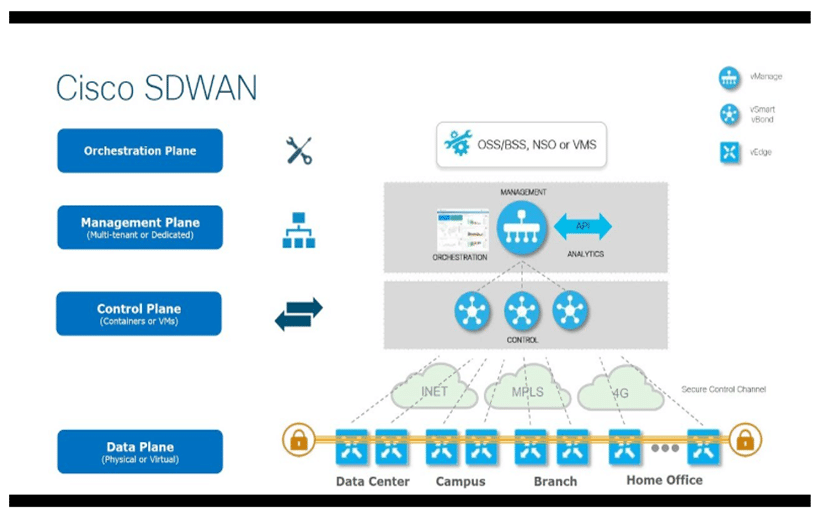 4. Orchestration Plane: Managed by vBond, which authenticates devices and establishes overlay tunnels.