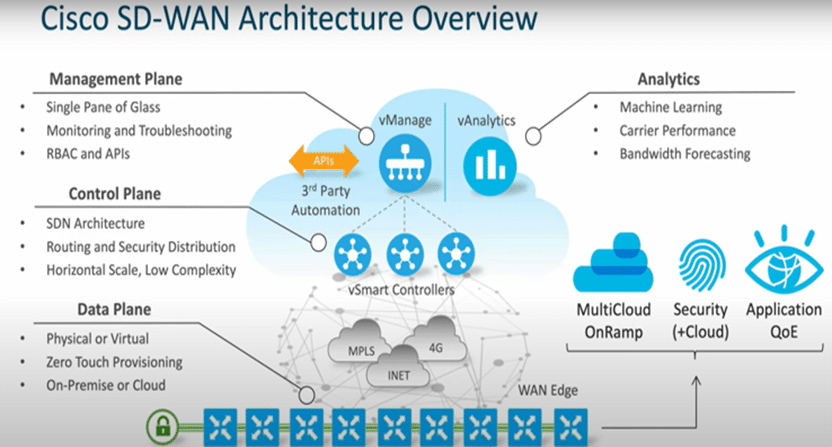 2. Control Plane: Managed by vSmart Controllers, which distribute routing information and enforce policies.
